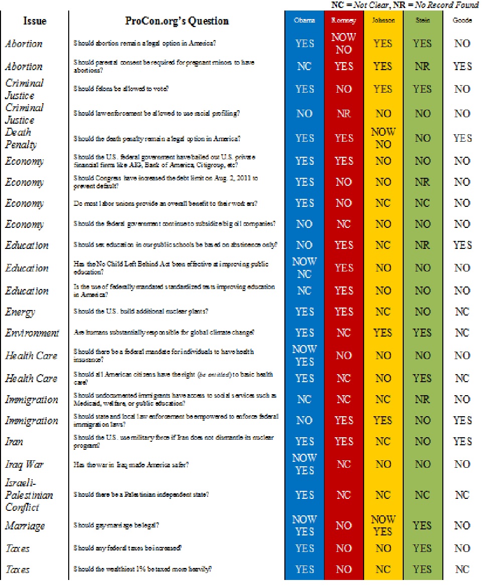 The policy issues presented in the table are not all the hot topics the candidates and their parties have debated. I strongly urge that you go to ProCon.org’s website and take a long look over all the issues and become familiar with each candidate’s perspective. Remember too, this table represents the federal issues; as an American citizen you also have similar policy-issues on your state and local levels too. Find them, thoroughly review them, and vote! If you are not yet registered to vote in your county, you have until Oct. 9th to get registered. Make your voice count!