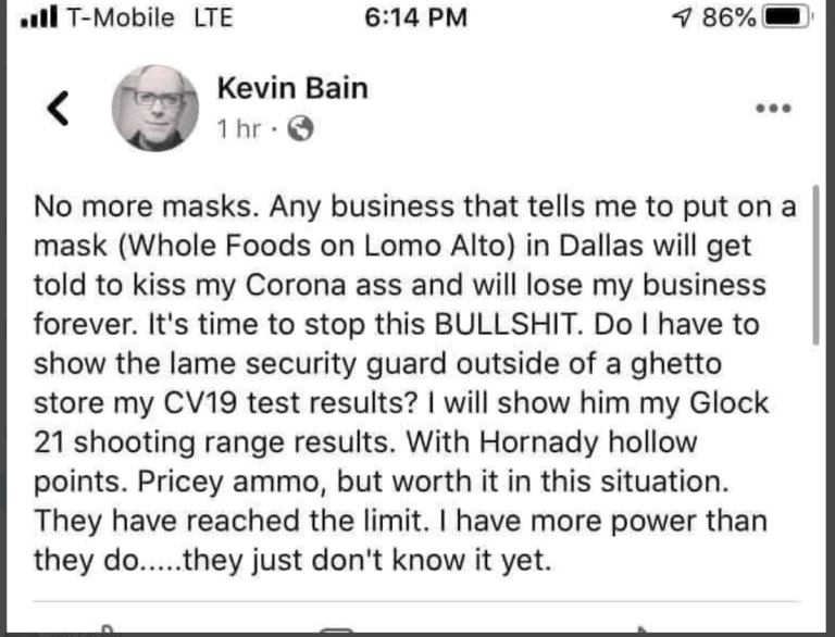 K Bain Psychosis Published May 12, 2020 at 768 × 586 in A Salute Before the Storm Bain’s psychotic message on Facebook