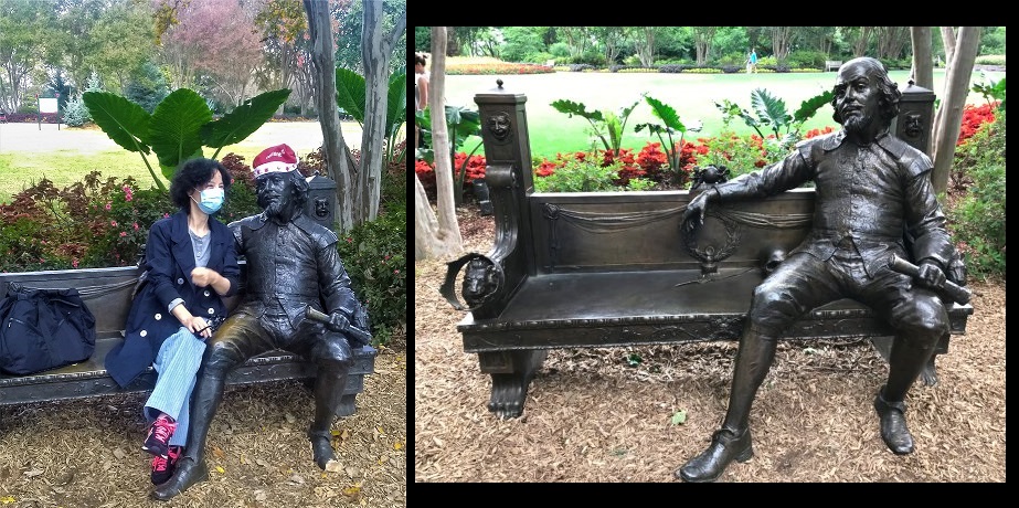 Making our way to the second lawn and bed Qin takes a cozy sit next to William Shakespeare on his bronze writing bench, “ไฝ ๅฅฝ๏ผๅจๅฉใ” (Nว hวo, wฤi lรฌ. or Hello Willy). With a stiff grin and the usual iambic pentameter Willy answers: