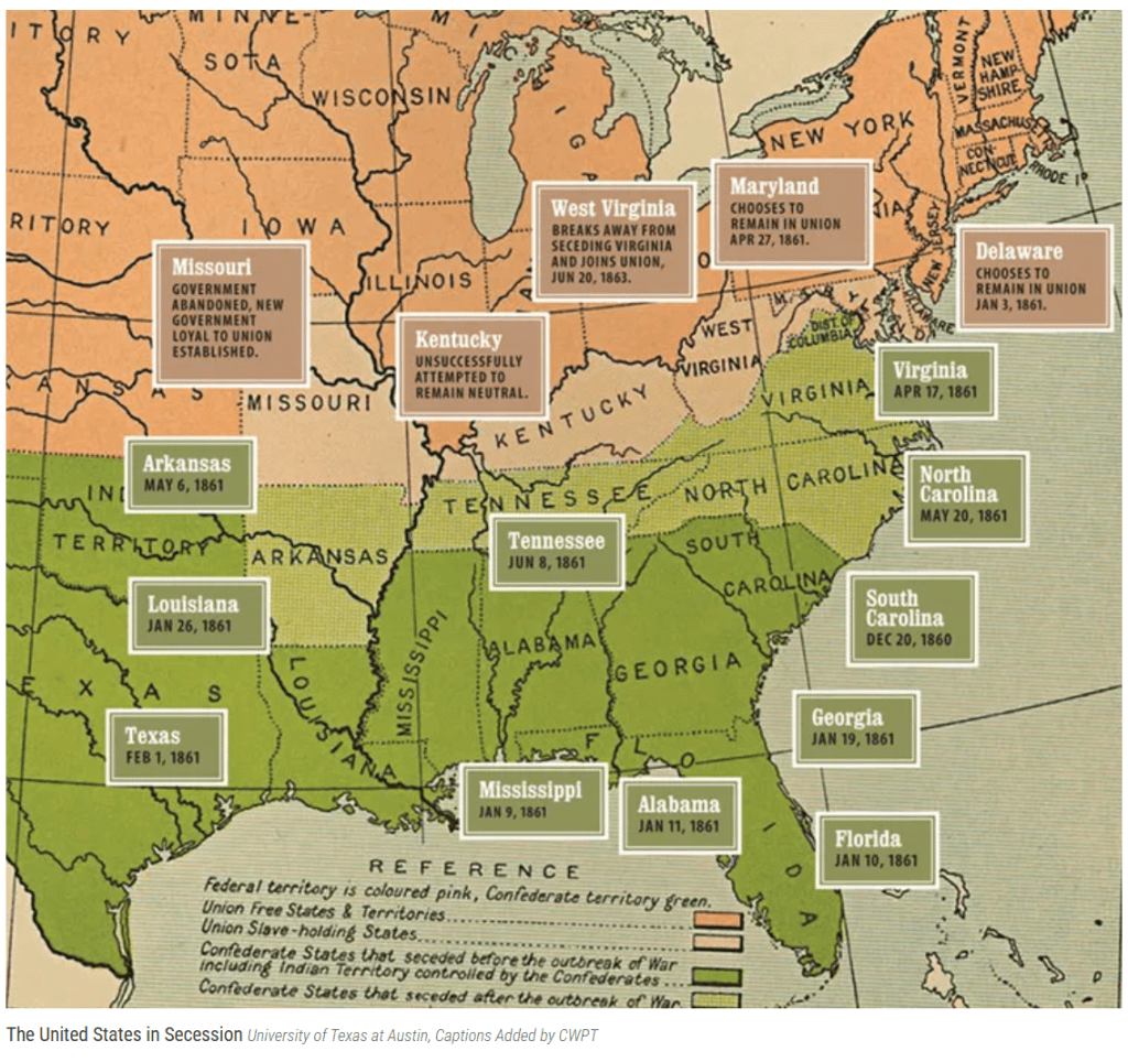 A more distinguishable modern map of the Confederacy (grey) and the Union (blue) by 1863