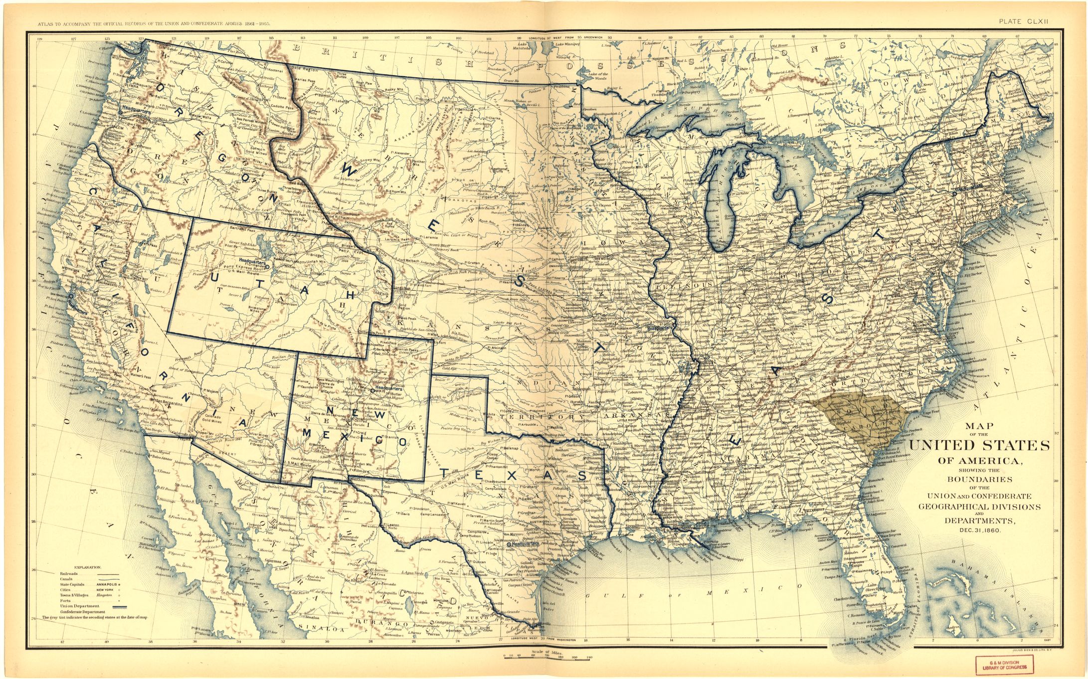 Dec. 1860 South Carolina was the South’s first state to secede from the United States of America because of their “slavery rights.” Afterwards South Carolina fired the first shots against the Union at Ft. Sumter. – U.S. War Department map