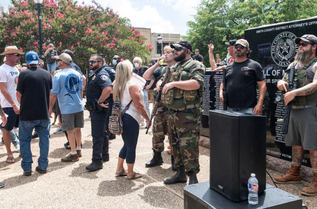 Armed Oath Keepers & Trump counter-protestors stand guard on Tyler Town Square after successful removal of “Protest for Portland” members. Note Tyler Police Officers joining guard. July 2020.