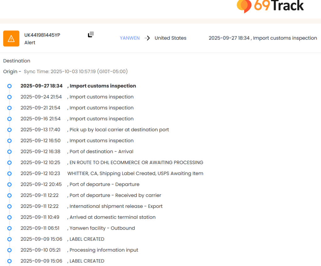 Notice that on 9/12/25 the order was received at Whittier, CA for “inspection,” and has been in inspection ever since. I mean, how hard is it to “inspect” t-shirts? Really? WTF!