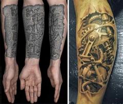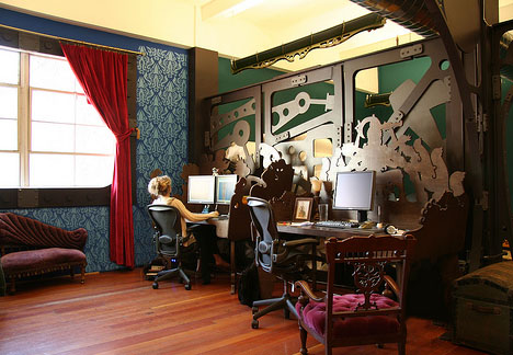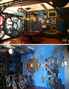 Oh but those gentlemen and their wacky contraptions. If you are unable to muster the courage to dress Steampunk in public, then there are fascinating alternatives. As pictured at the top, home and office Steampunk designs are found domestically. Because We Can is a firm based in West Oakland, CA specializing in “creative build-outs, interior design, custom furniture, whole creative environments, and buildings.” Think museums, homes, or offices are the limits of Steampunk’s appeal? Not even close. Computer monitors/televisions, desktops and laptops, telephones, cellphones, watches, guitars and other musical instruments, even automobiles and motorcycles and lest I forget….the skin of riders and drivers have not escaped the aesthetic.