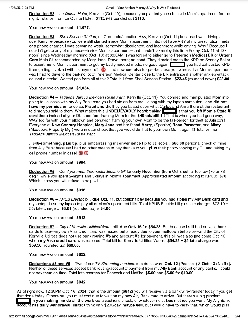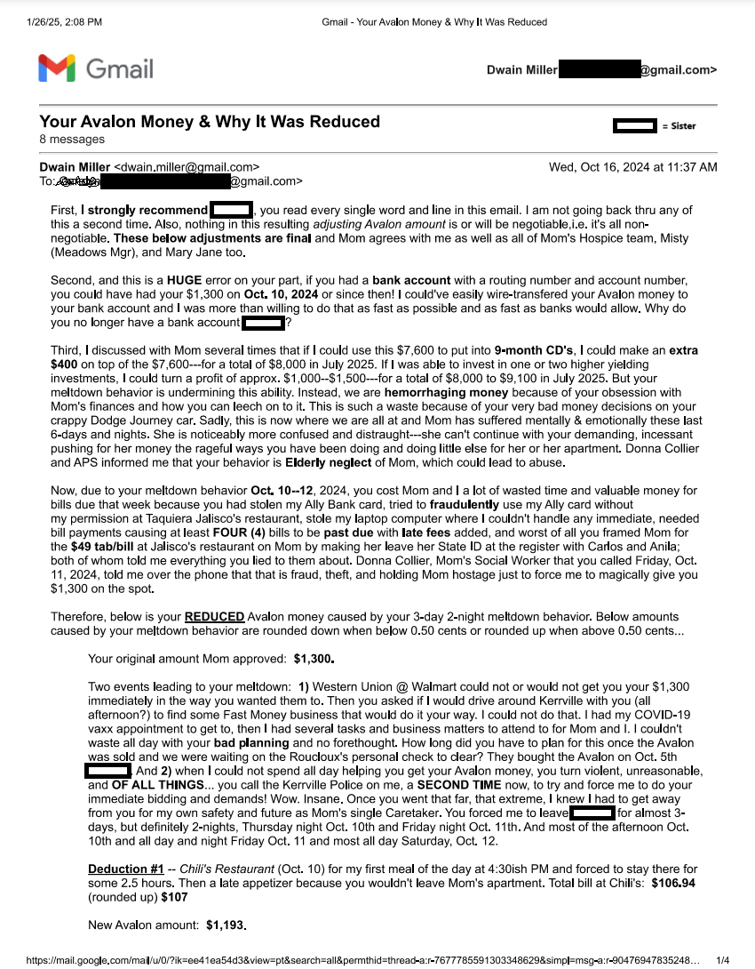 Should any of you wish to read the email (Page 1 click here, pg. 2 click here, short pg. 3 click here) I had to send to my sister about this latest 9-day/night psychotic meltdown on me—she was impossible to speak with civilly or maturely and logically those days and nights that I had to get a hotel room 2-nights when she wouldn’t leave Mom’s apartment—so consequently we have yet to speak to each other either in person or by phone or text message. She’s been and still being a royal, immature, asshole to me over a situation I had no control over whatsoever. As is often the case with arguing family members, the initial issue and subsequent meltdown at Walmart had to do with money, her portion of money Mom said she could have from the sale of Mom’s 2007 Toyota Avalon XL Sedan that I had completed after 4-months listed, all by myself, on Oct. 5th, 2024 for $7,600. The rest of the insanity is available via the “click here” links above.