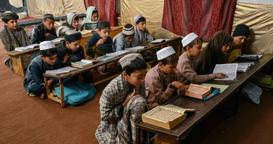 A Taliban Quran school engraining lessons through repeated citations over and over bobbing their heads up and down over their Holy Scriptures
