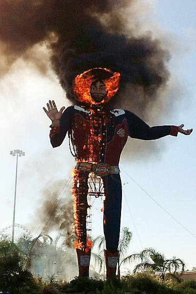 Some of you may have seen or read this story last year. It was bigger news than many realized. One of Texas’ iconic symbols of everything big in Texas lost its Alpha-male high-testosterone image by losing his Dickie-brand shirt, his hat, his boots, and more embarrassingly his Dickie jeans. Female witnesses with libidos in high-gear, watched with baited horniness to see what Big Tex had underneath his 284W-185L jeans. When the smoke and fire cleared hetero-Texas was as devastated as Tin-man, Scarecrow, and Lion when the curtain of the Great Oz came down.
